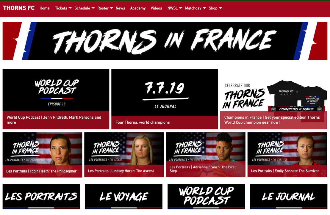 An immersive storytelling initiative to highlight the club’s nine 2019 World Cup participants. Featured a diverse content mix across various forms of media, including videos, podcasts, recurring journals and written features. Also included a consumer product and logo design component. The “Thorns in France” campaign generated 500,000+ engagements across the club’s social channels and was one of the top sell-through lines that season.